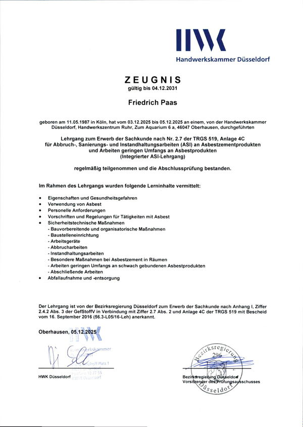 Sachkunde nach Nr. 2.7 der TRGS 519, Anlage 4c - Arbeiten mit Asbestprodukten